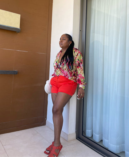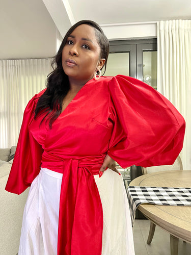 Holiday Red “UGANDA” Puff Sleeved Wrap Top
