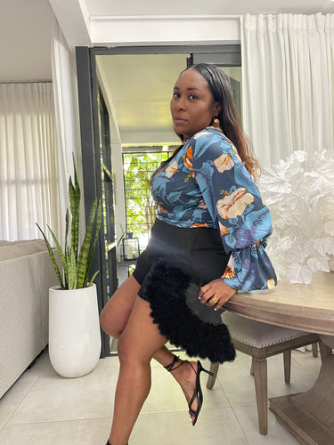 Deep Blue Orange Hibiscus “Nigeria” Mini Bell Sleeved Top