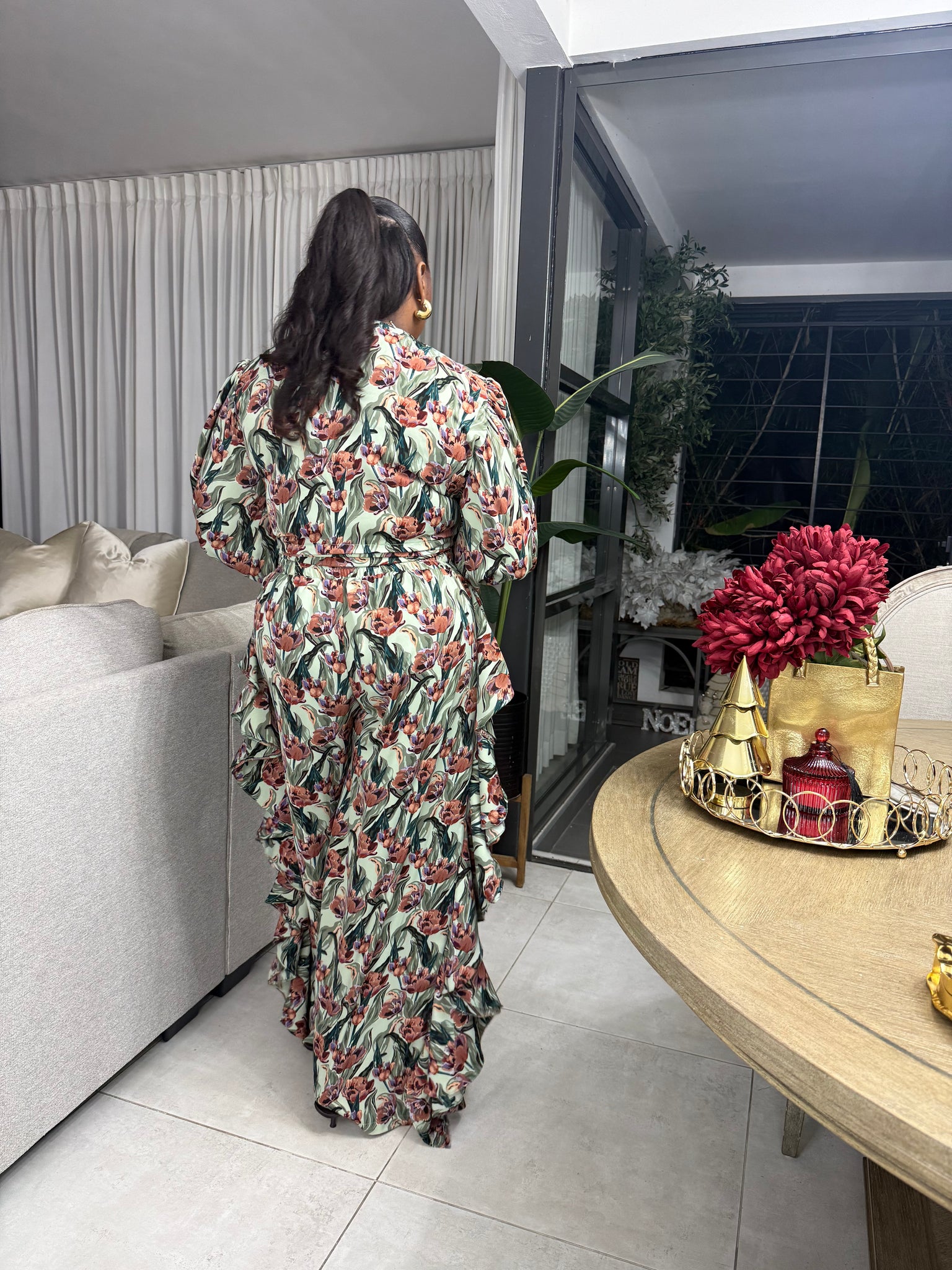Soft, romantic, and artfully bold. Set on a muted sage base, this botanical floral mixes warm terracotta and rust blooms with touches of lilac and deep teal leaves for a rich, elevated palette. The print feels like wearable art perfect for holiday dinners, destination celebrations, and any moment you want effortless drama without the heavy feel.